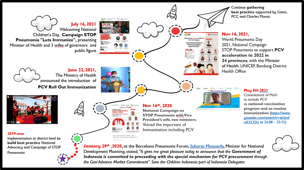 The road to protecting children from pneumonia was not a single event, but a journey of persistence and collaboration. From the very beginning, the STOP Pneumonia campaign consistently supported the Ministry of Health in strengthening immunization programs—raising awareness among parents, communities, and decision-makers about the life-saving importance of vaccines like PCV (Pneumococcal Conjugate Vaccine). At the national level, the campaign worked alongside the Ministry to engage ministers, governors’ representatives, and public figures. At the district level, it partnered with health offices and village midwives to ensure children in remote areas could catch up on their missed immunizations—even during the Covid-19 pandemic.Each milestone along this journey—whether a public pledge, a policy commitment, or a grassroots immunization drive—reflected the campaign’s steady collaboration with the Ministry of Health. Together, these efforts accelerated the introduction of the PCV vaccine and paved the way for its inclusion in the Ministry’s Basic and Complete Routine Immunization program, protecting thousands of children across Indonesia.